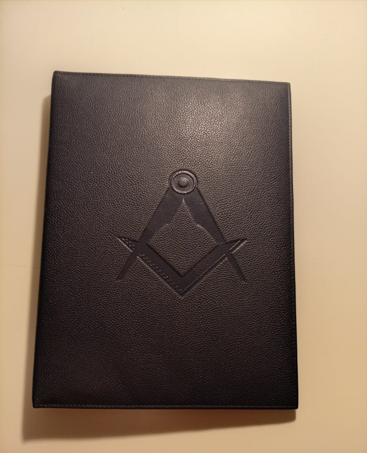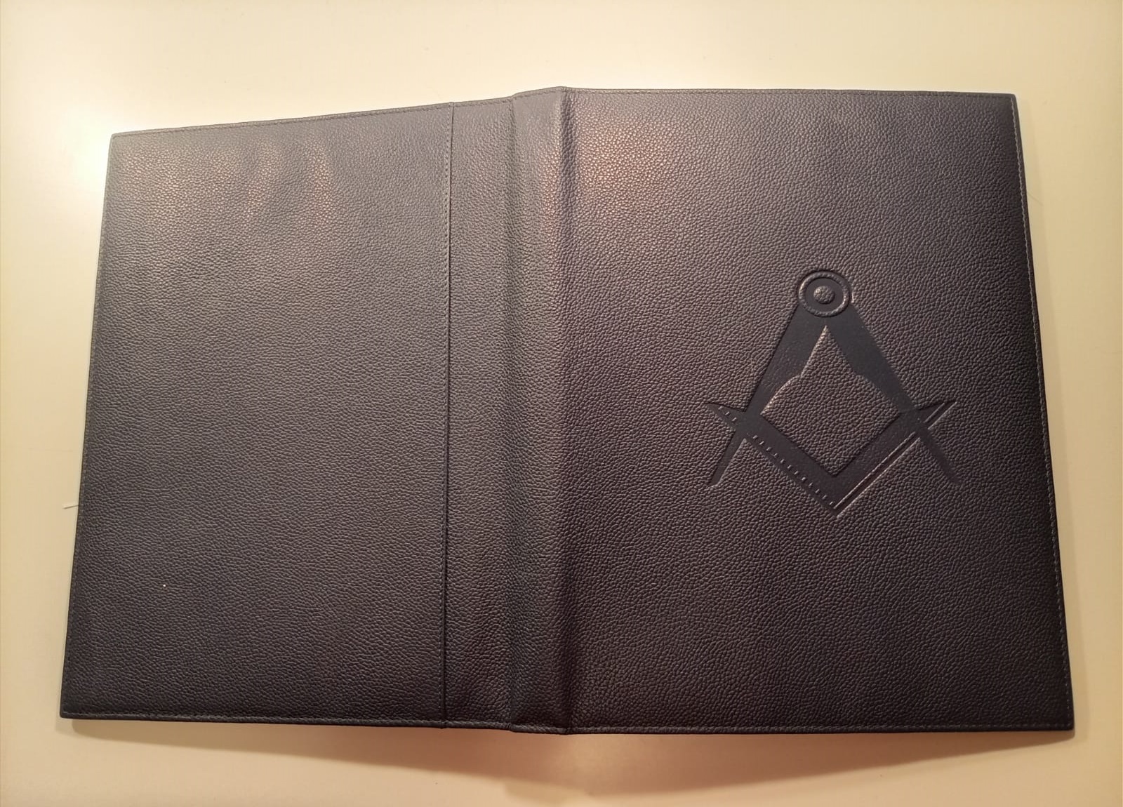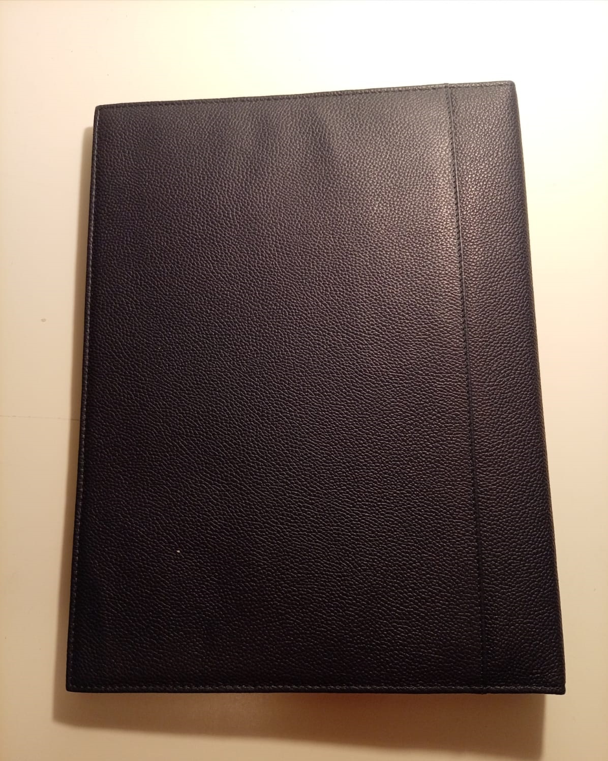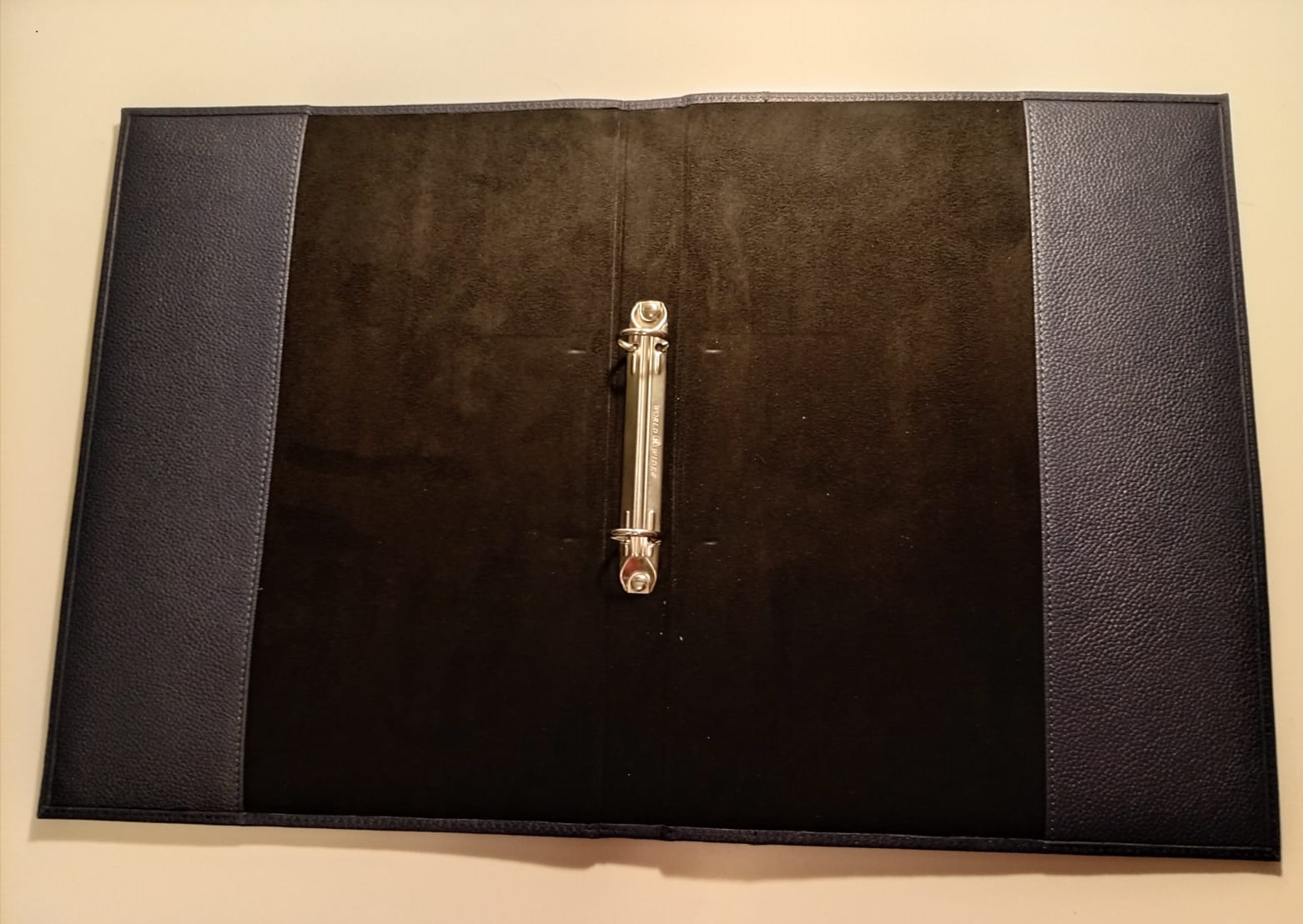 Läderpärm i A4-format med sidofack (insida). Logotyp på omslaget. Liten ringmekanism, ringdiameter 2 cm.En liten omgång förnyade mappar kommer, du kan förbeställa här!Pris 52 €.
